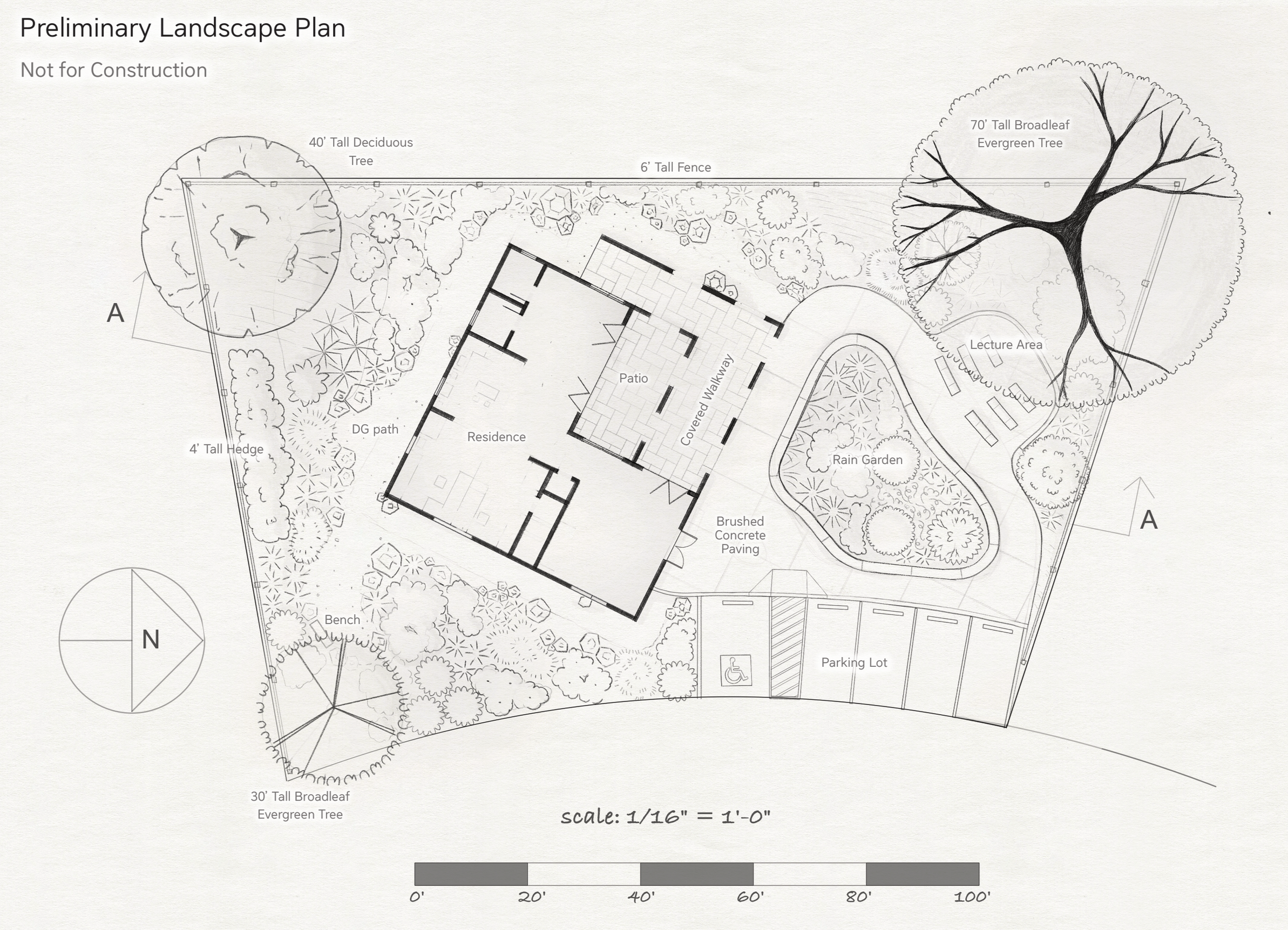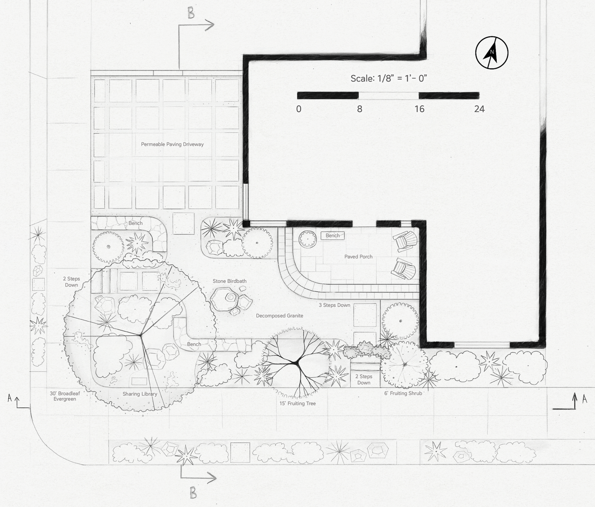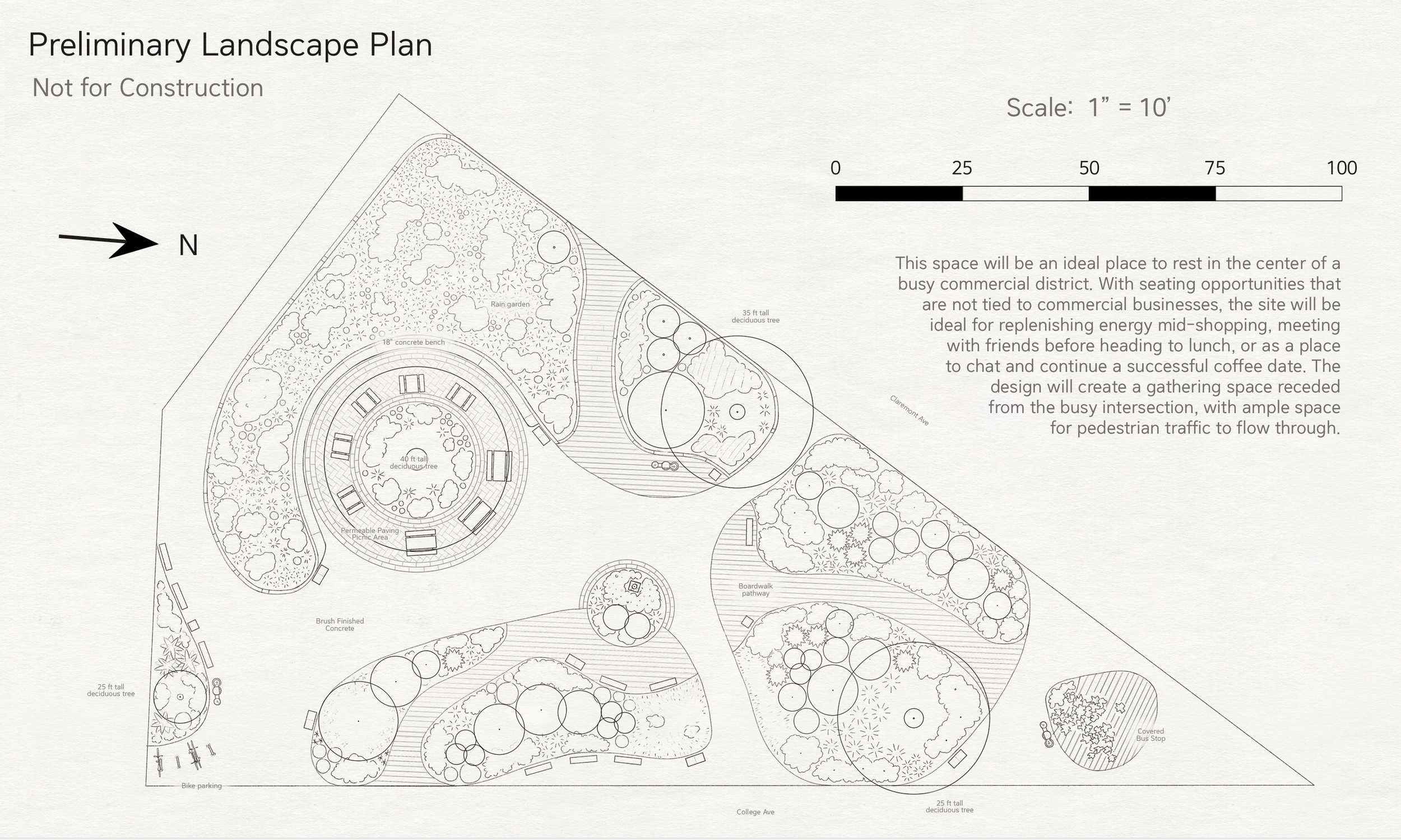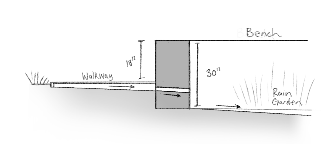 Detail drawing of rain garden and lecture space. Drawn by Nastia Garachtchenko.